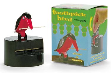 ... Leo manages to surpass himself. From Archie McPhee, the Toothpick Bird is a modern reproduction of a 1958 original. You push down the head of the woodpecker and it will pick up a toothpick ready for you.