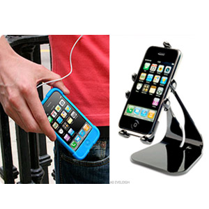 Leo must be clearing the clutter from under his desk, and gives us a second gadget for TTTT. The PED3 is a rotating stand made of steel for the iPhone (or iPod Touch, the model for which is PED3-T), holding the device by 6 fingers or clips. Ideal for keeping your iPhone on the desk, or on the tray in front of you during a flght. Mike Talmadge of thoughtout.biz also makes dock stands for other iPods.